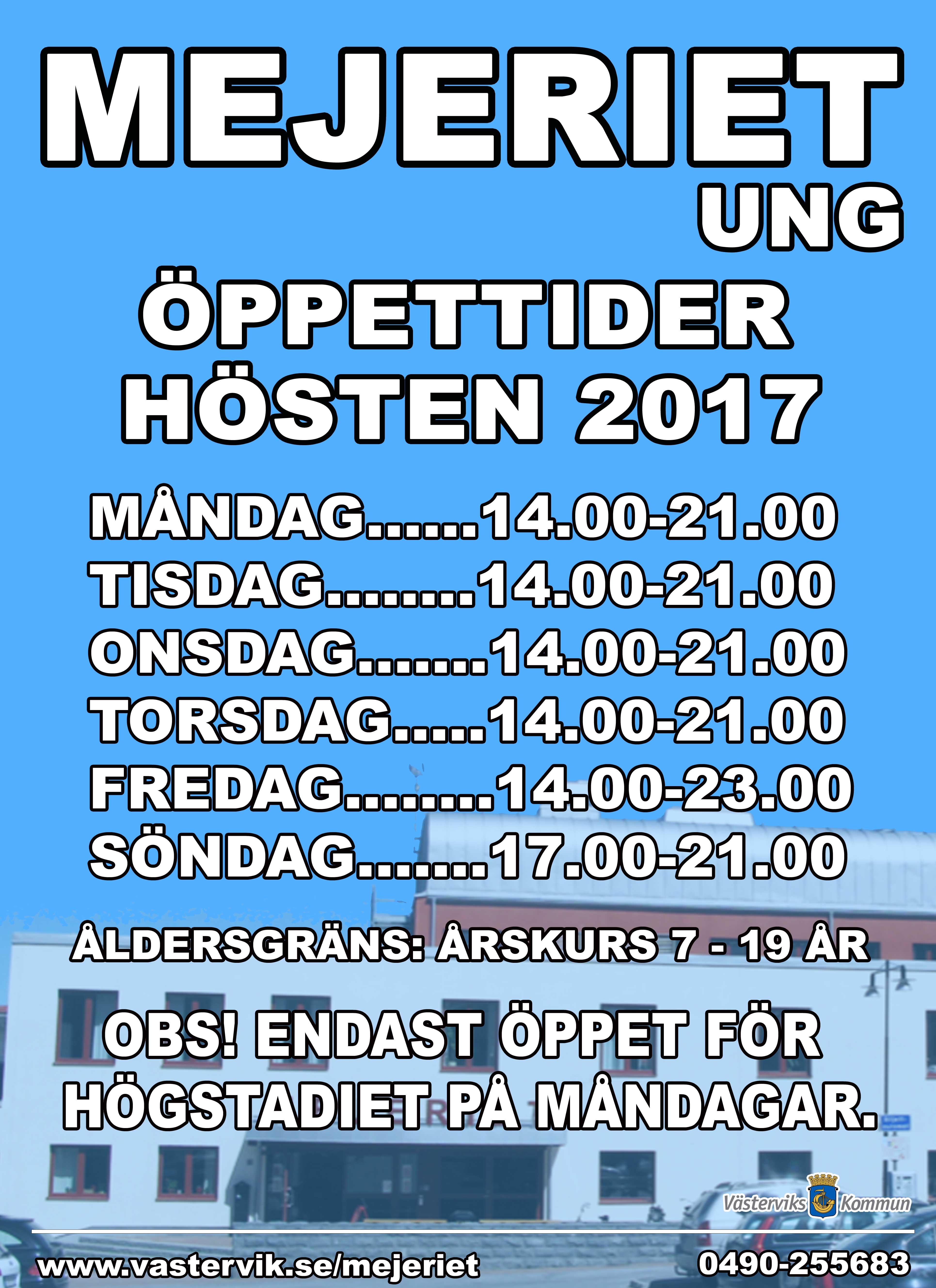 Följ oss på Facebook (Mejeriet UNG) instagram (@mejerietung) och snapchat (@mejerietung) för inlägg om vad som händer hos oss på Mejeriet UNG!