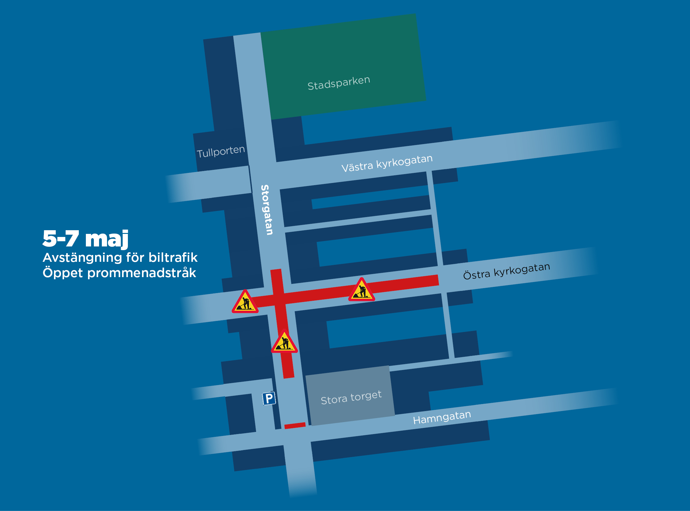 Vi stänger då av en större del av Storgatan från Stora torget och uppåt samt delar av Östra Kyrkogatan. Bilar kommer då inte kunna ansluta till Storgatan från Ellen Key-sidan via Östra Kyrkogatan. Däremot kommer Storgatans översta del från Västra Kyrkogatan fortfarande vara öppen.