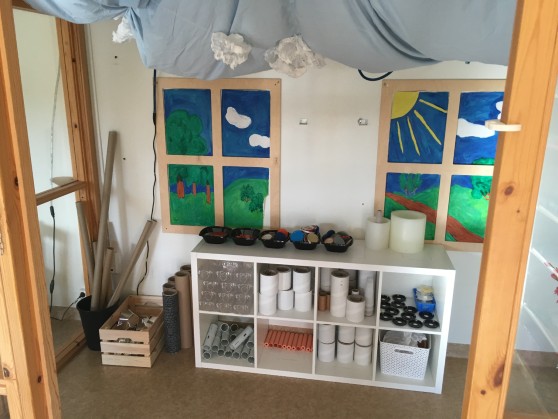 Ur Plattformen: “Rummets utformning, inom- och utomhus, liksom det material som erbjuds har stor betydelse för möjligheten till möten, för kvaliteten i den pedagogiska verksamheten, för barnens lärande och möjlighet till egna val i vardagen. /../ För att främja olika kreativa möten som bjuder in till kommunikation på många olika sätt, blir det viktigt att möblera med många mötesplatser/rum i rummen, och för den lilla gruppen. För att barnen skall kunna vara kreativa, självständiga och göra egna val behöver barnens arbetsplatser medvetet organiseras och understödja: tillgänglighet, möbler i barnens nivå samt tydlighet.