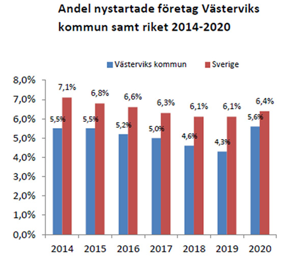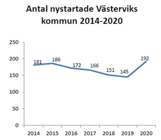 Trots den påverkan och oro som pandemin skapade ökade antalet företag i Västerviks kommun. 192 nya företag startades under första halvåret, en ökning med 47 företag jämfört med 2019. Det var den högsta ökningen av nya företag de senaste sju åren och bröt en tidigare minskande trend. Den starka ökningen bidrog till att andelen nya företag som andel av totalt antal företag i kommunen ökade kraftigt och börjar att närma sig riksgenomsnittet.