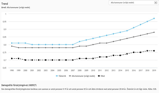Inte bara antalet i befolkningen utan även sammansättningen åldersmässigt är viktigt att följa. Antal födda understiger antal döda och antalet äldre ökar. Även den demografiska försörjningskvoten ökar. Nedanstående diagram är hämtat från Kolada.se och visar utvecklingen av den demografiska försörjningskvoten, dvs hur många personer var och en i arbetskraften ska försörja ytterligare. Ett lågt tal är att föredra. Senaste tillgängliga statistiken är från 2019.