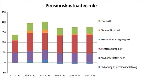 Nedan ses Skandias beräkningar och prognoser över pensionskostnader och pensionsskuldens utveckling per 22-12-31.