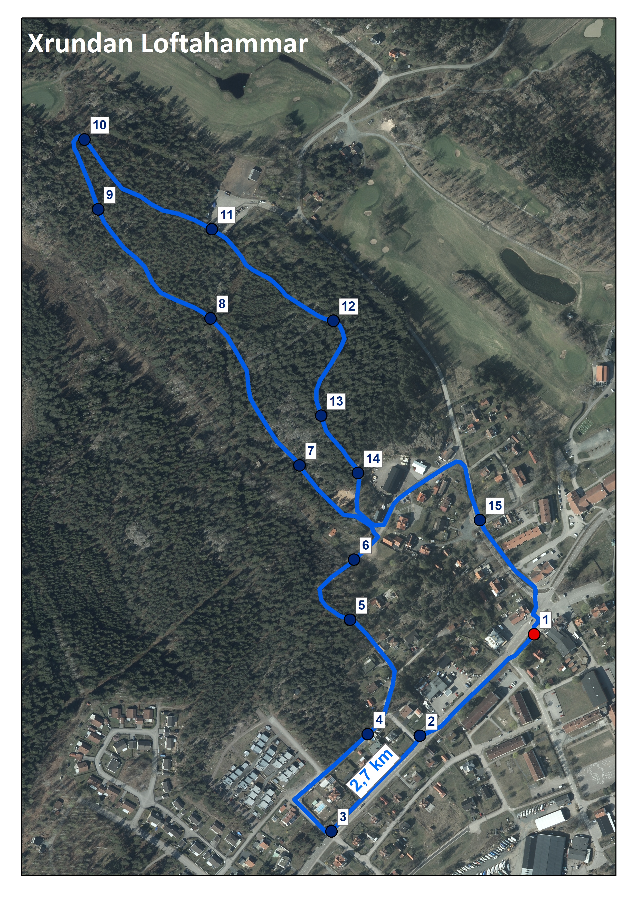 Starten för rundan är vid informationsskylten till höger om affären. Den går medurs och är cirka 2,7 kilometer lång. Terrängen består av både asfalt, grässtigar och motionsslinga.