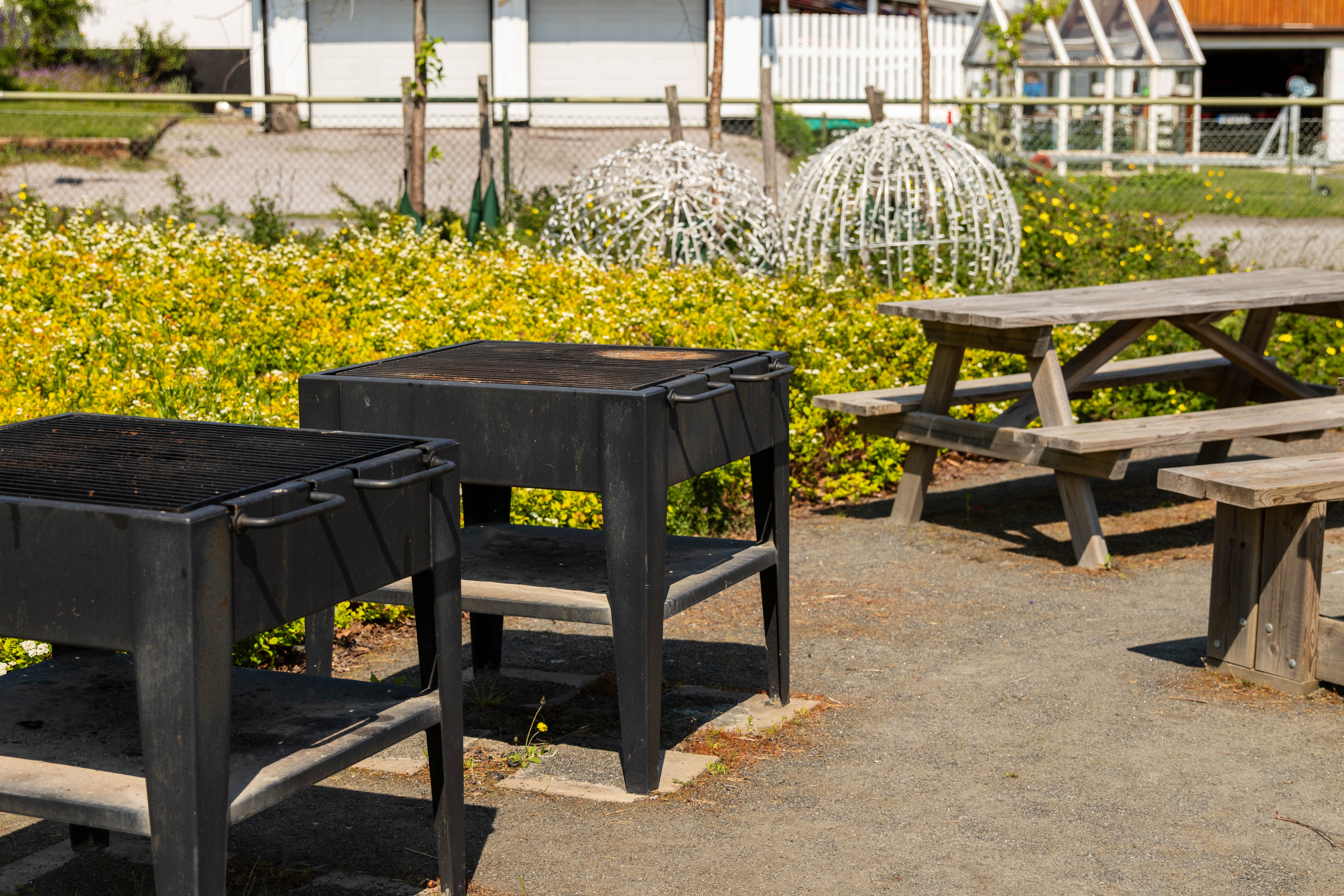 Runt lekplatsen finns grillar och bord med sittplatser. En inbjudande plats för paus och en bit mat.