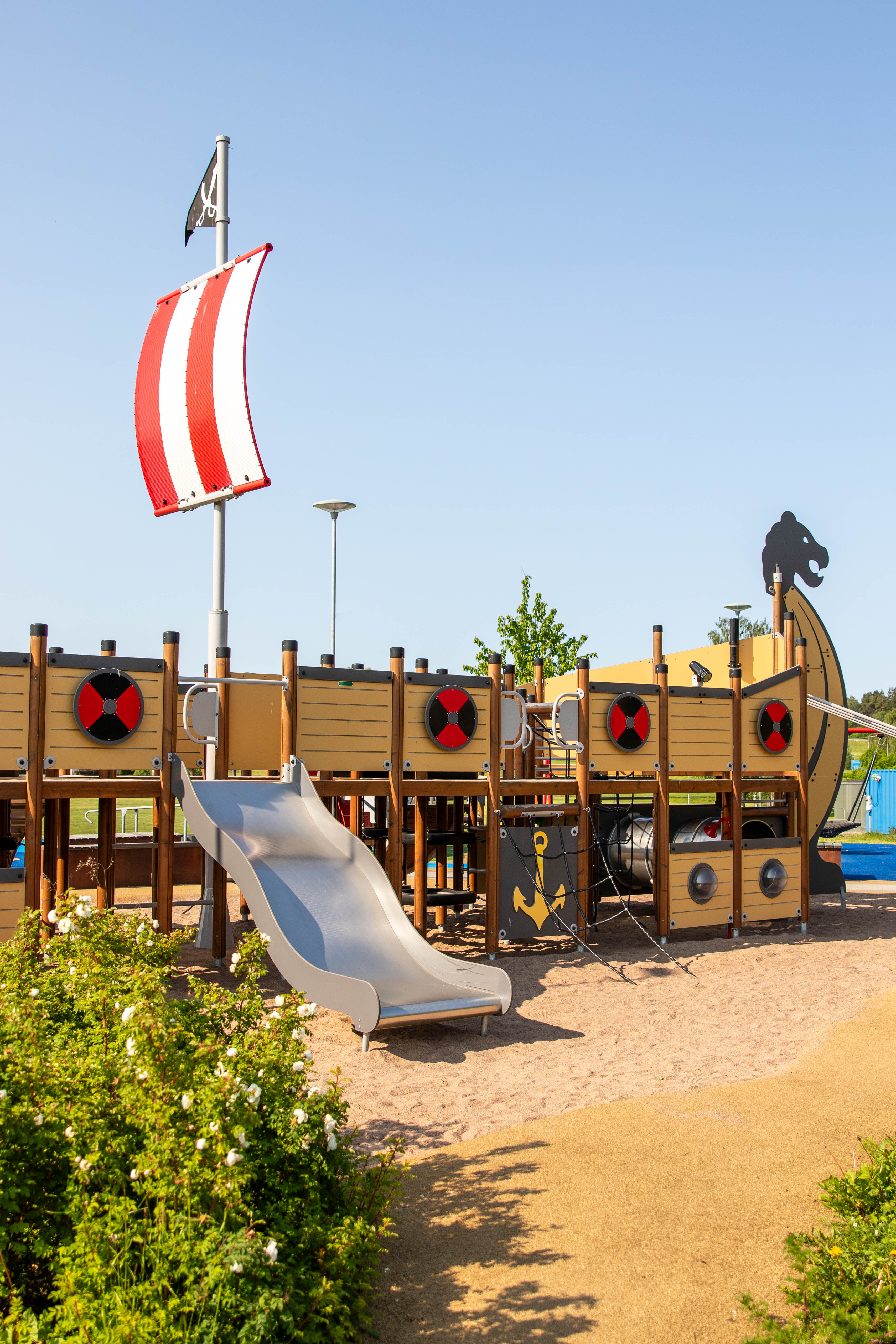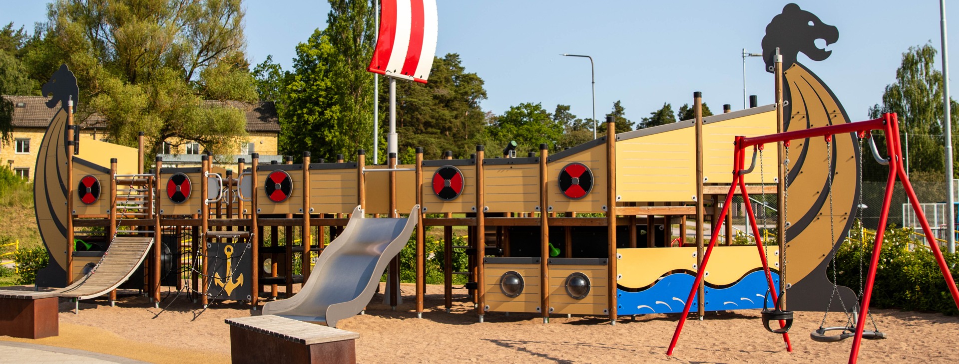 Intill skeppet finns gungor där du kan susa genom luften, högt upp som en fågel. Vid sandlådan står ett bakbord som passar alla, även dig som sitter i rullstol. Sandlådan är perfekt för att baka sandkakor, gräva tunnlar eller bygga ett riktigt sandslott.