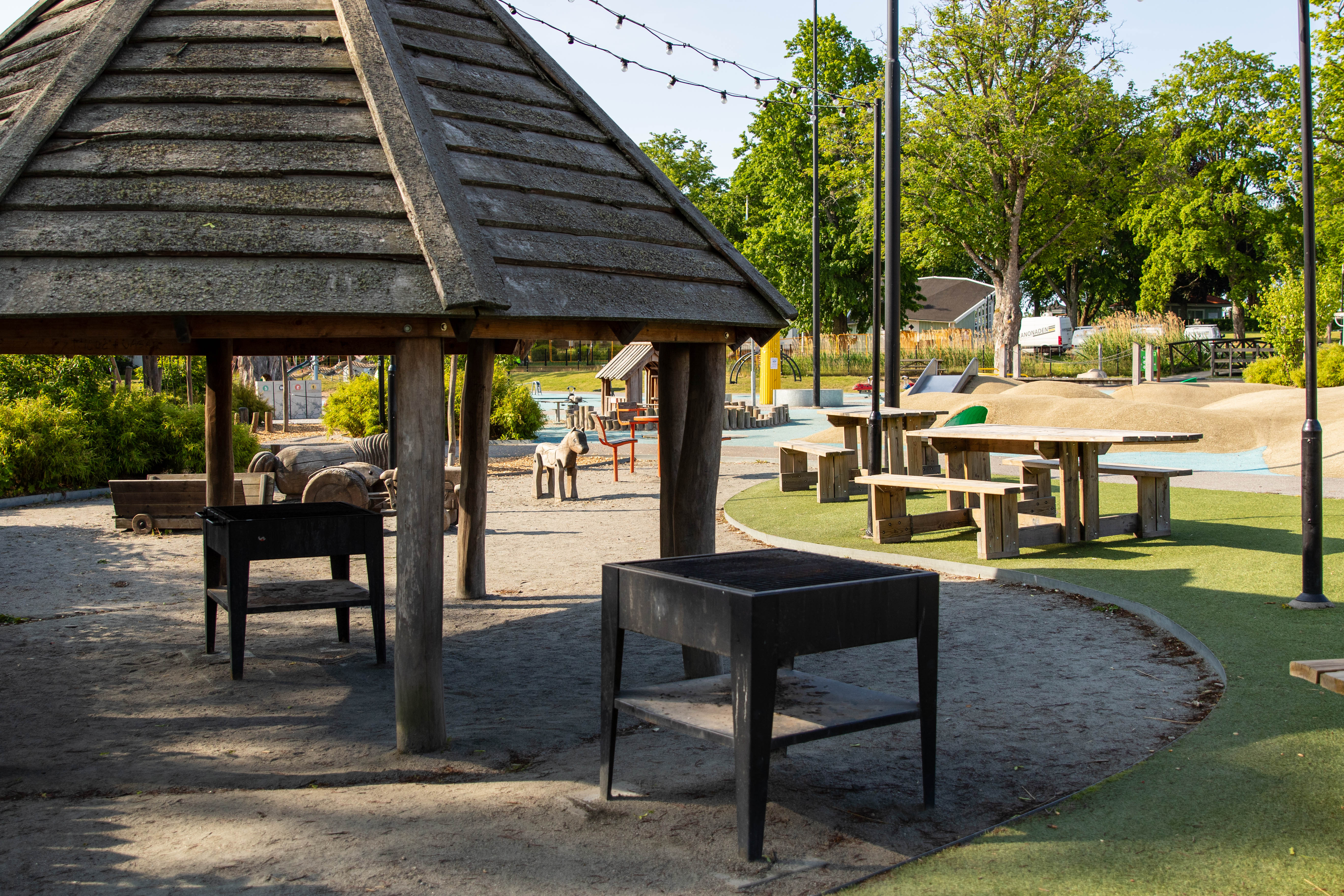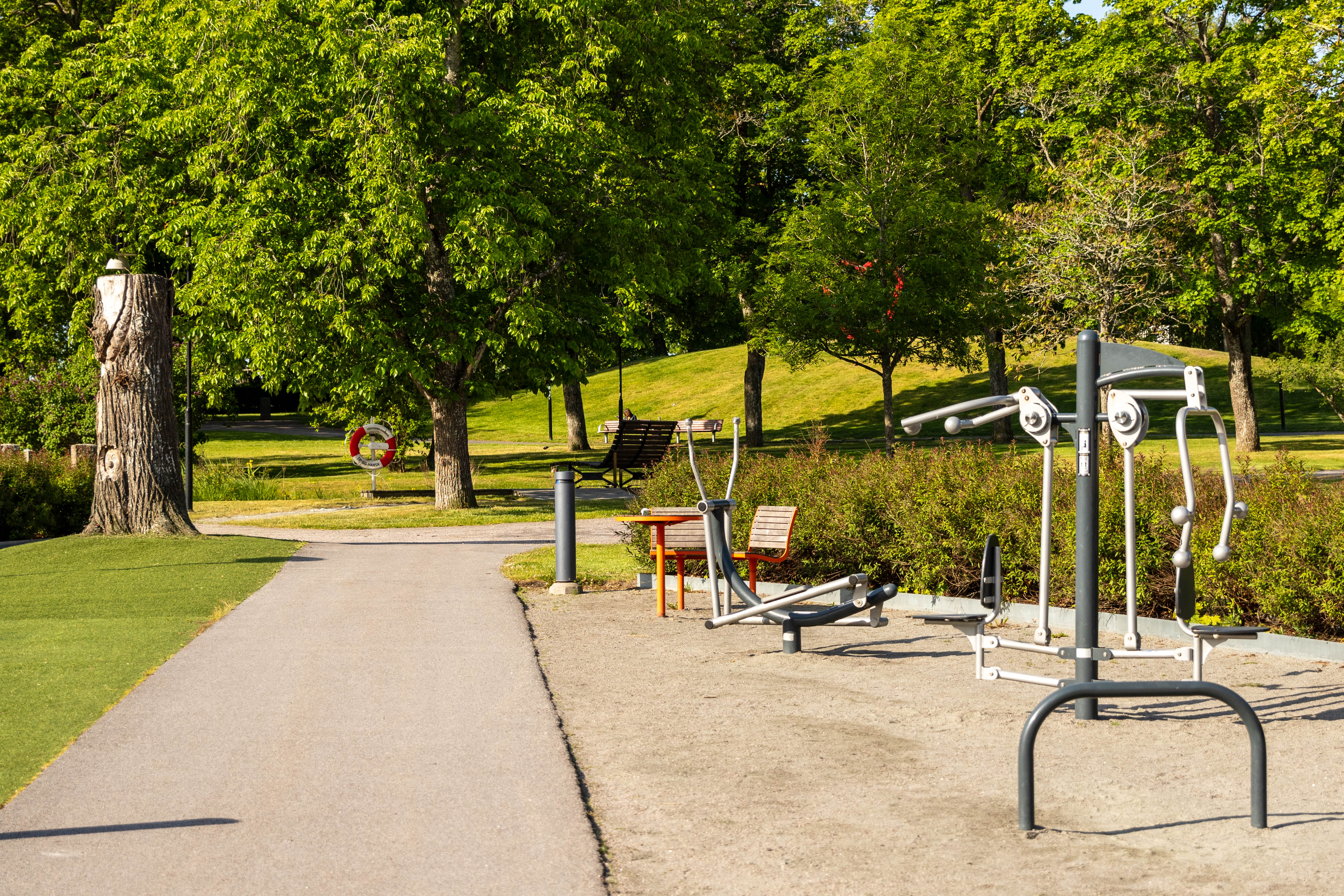 Runt omkring finns gott om sittplatser, gröna ytor och grillmöjligheter som gör det enkelt att stanna lite längre. Här finns också ett utegym för den som vill träna.