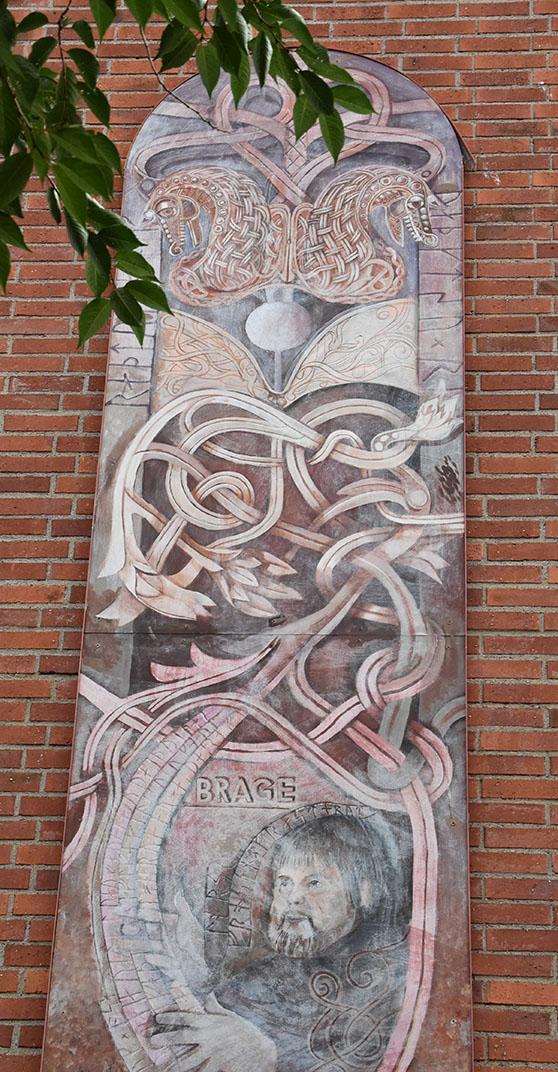 Skaldekonstens gud som bara talade på vers. Bara hans fader Oden kunde mäta sig med honom i skaldekonst. Brage är gift med ungdomens gudinna Idun som sköter äppleträdet som ger gudarna evig ungdom. Ett äpple om året ger gudarna evig ungdom. Modell för ansiktet var Lars ”Frosse” Frosterud.