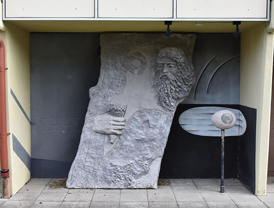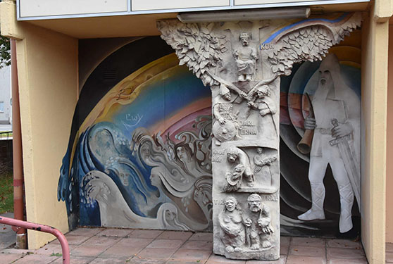 Information: Bildstenen Västervik symboliserad med en stiliserad kogg och ”ostkustens pärla”. På andra sidan Midgårdsormen som omsluter hela världen.