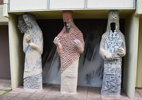 Information: Nornorna Ödesgudinnorna vaktar vid Urdabrunnen – ödets källa. Urd spinner livets tråd till varje människa, Verdandi förvaltar ödet och Skuld följer var och en tills det är dags att klippa tråden