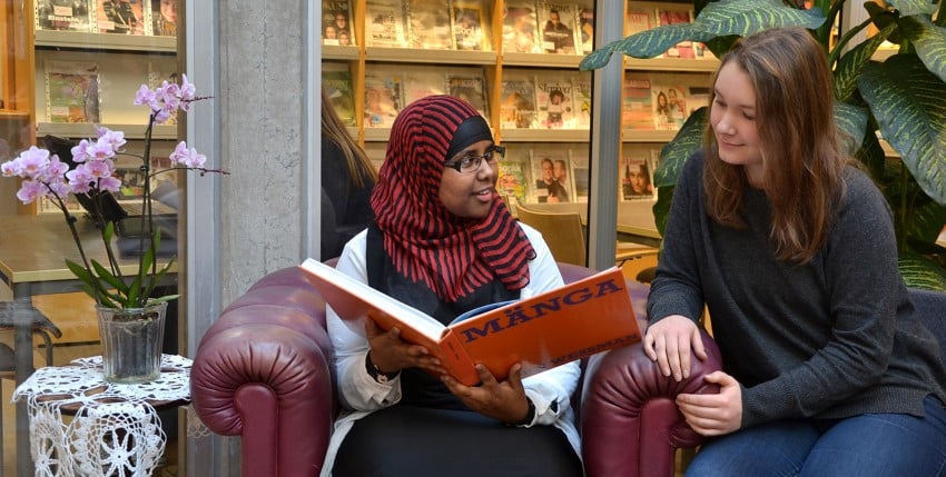 Börja med att läsa på i en bok! Testa själv att leta i hyllorna och i bibliotekskatalogen, men var inte rädd för att fråga bibliotekspersonalen om hjälp!