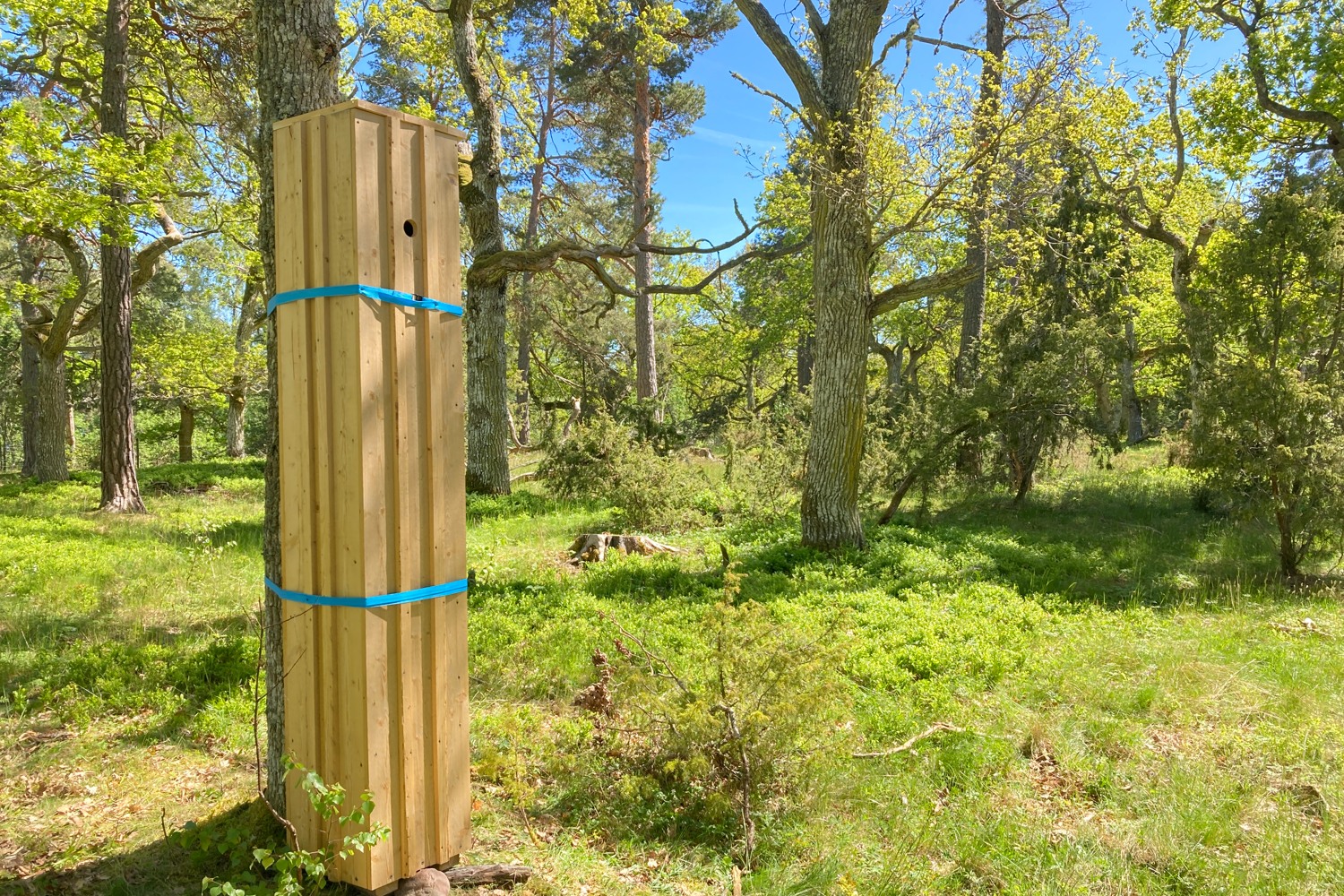 Därför har vi satt upp mulmholkar. Det är specialbyggda "låtsasträd" som ser ut som stora fågelholkar. Inuti fyller vi de med ekspån och löv, som så småningom blir till mulm – ett smuligt material som många insekter älskar att bo i.